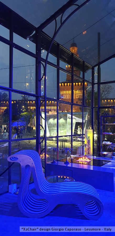 Inside the DDN Phutura event, an exhibition dedicated to solutions for living and contemporary living, La Fenice greenhouses by Privitera Eventi hosted the green furnishings in 100% recyclable cardboard by Giorgio Caporaso for Lessmore. Among these is the More Desk Plus table, Tappo the coffee table with lichens for a new concept of 'nature-oriented' beauty and functionality and X2CHAIR - chaise longue & armchair, More-Light bookcase system and More Stender coat hanger, made for the occasion in a special edition with gold leaf finishes.